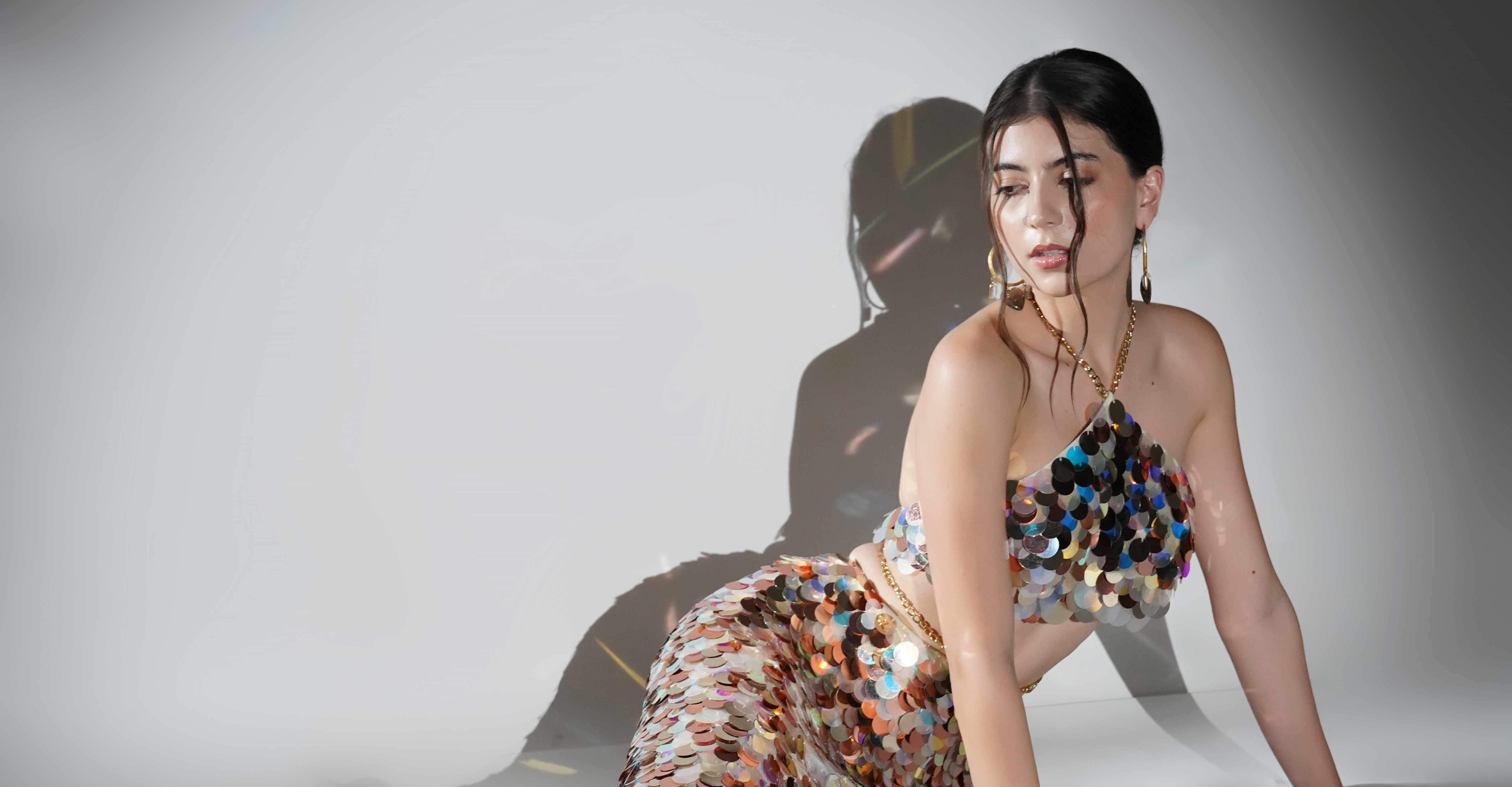 Keerthy brings energy to Nain Matakka, and her beauty shines even brighter in the Anastasia Holographic Sequin Mini Dress.